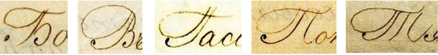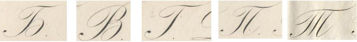 Capital letters "Б", "В", "Г", "П", "T" in 1854 Dostoevsky’s manuscript