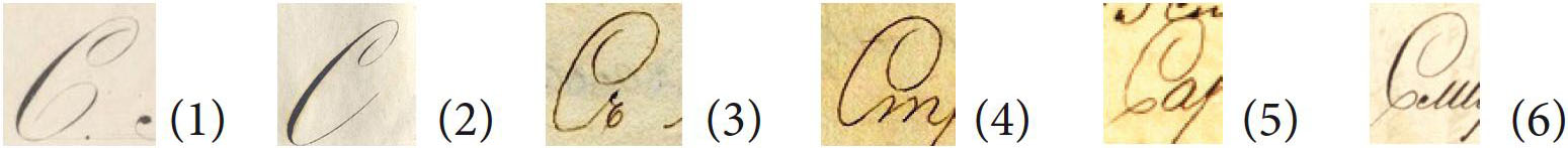 The capital letter “C” in the cursive workbooks (1, 2), in 1854 Dostoevsky’s manuscript for (3, 4) and in his notebooks (5, 6)