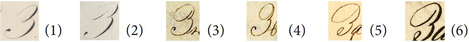 Capital letter “З” in the cursive workbooks of the 1830–1850s (1, 2), in 1854 Dostoevsky’s manuscript (3, 4) and in his notebooks (5, 6)