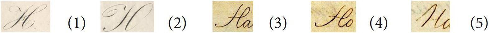 The capital letter “Н” in the cursive workbooks (1, 2) and in 1854 Dostoevsky’s manuscript (3, 4, 5)