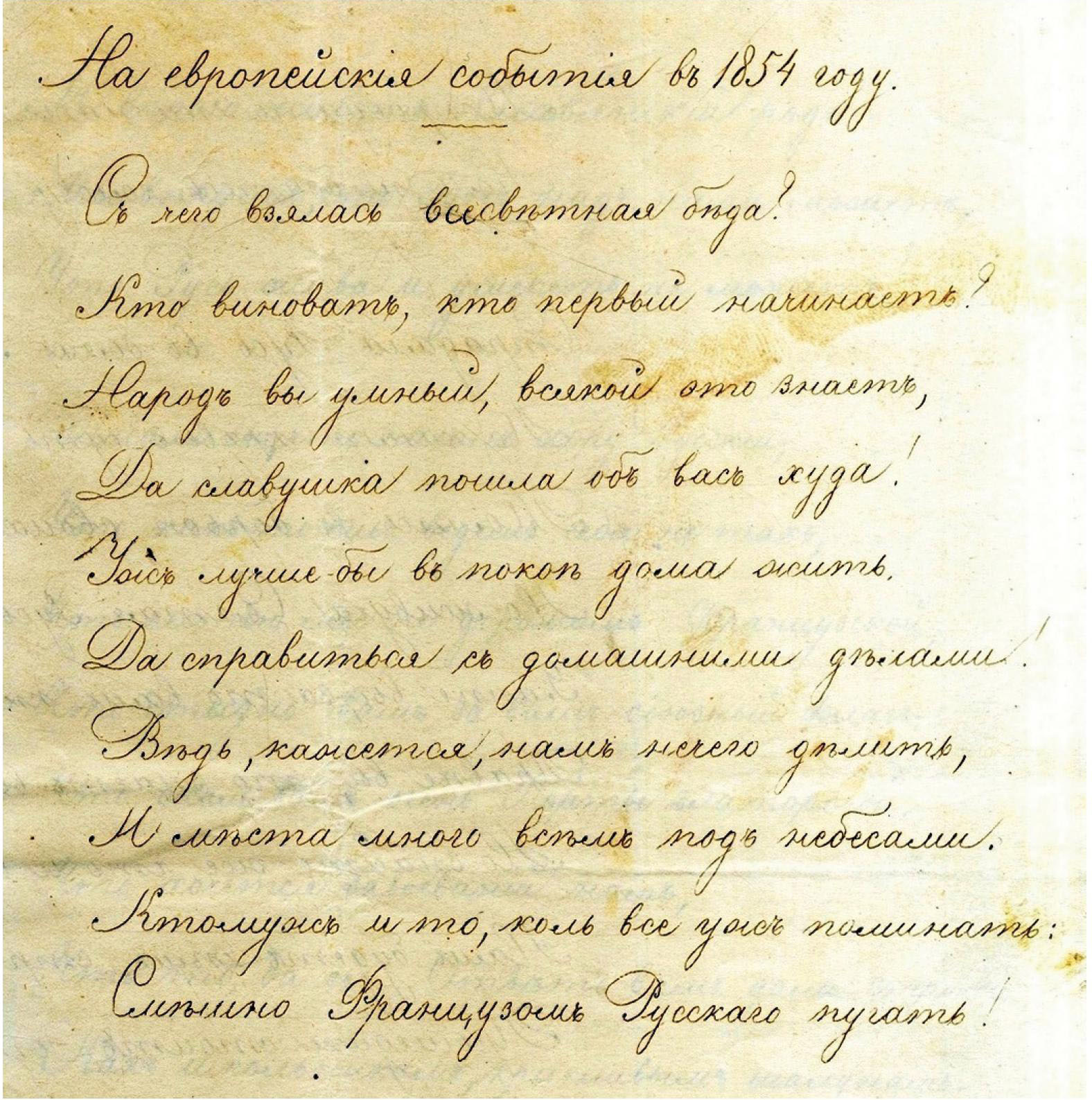 Title and first stanza of the autograph of Dostoevsky’s poem “On the European Events of 1854”