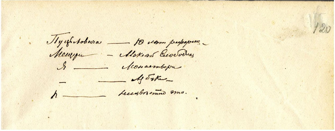 Fig. 1. Fragment of a page of F. M. Dostoevsky's notebook of 1872–1873 with the entry “Meshchersky — Aleksey Slobodin” (Russian Archive of Literature and Art. Fund 212.1.9. P. 120)