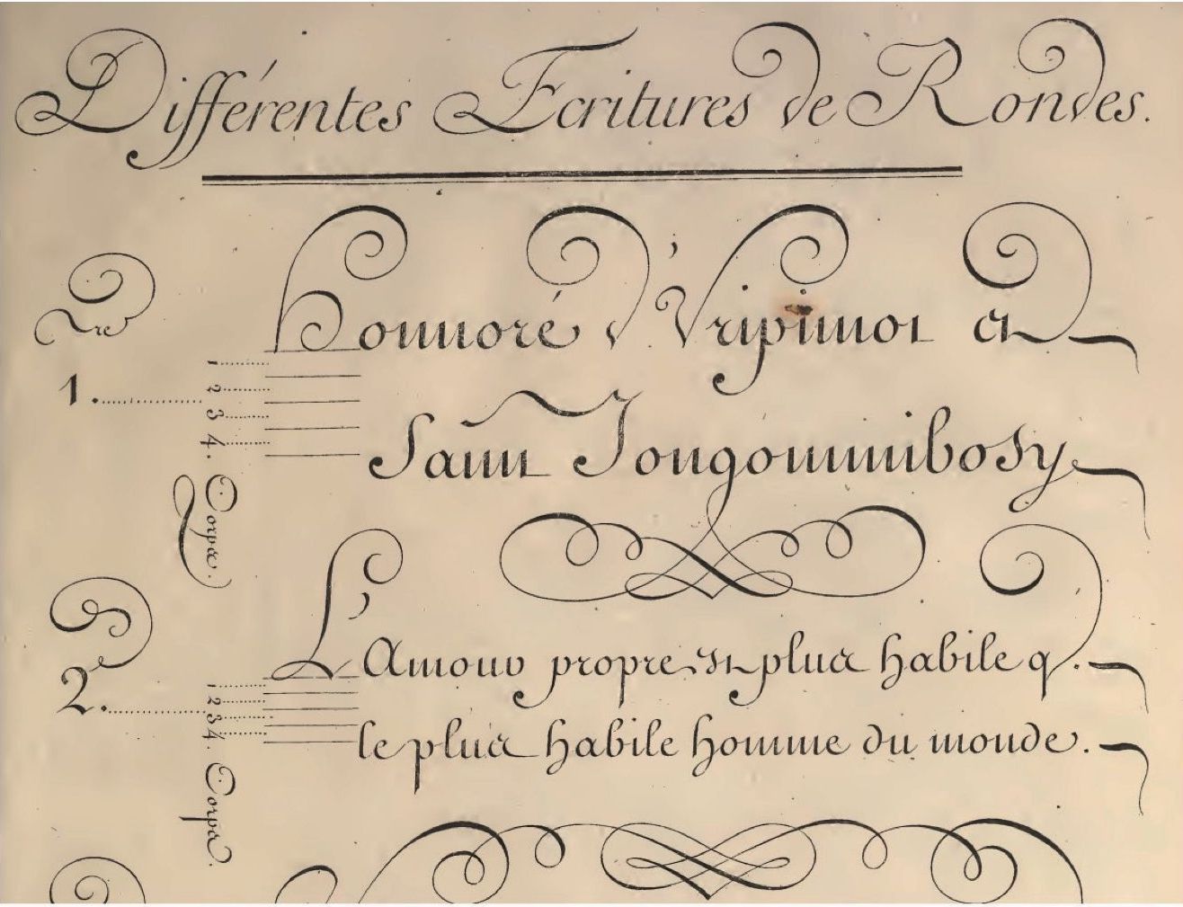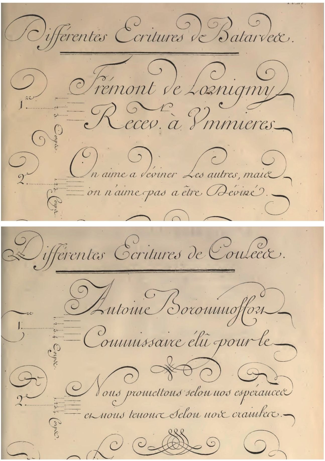 Илл. 5–6. Образец бастарда. Образец куле. “Recueil de planches, sur les sciences, les arts libéraux, et les arts méchaniques…” (1763)