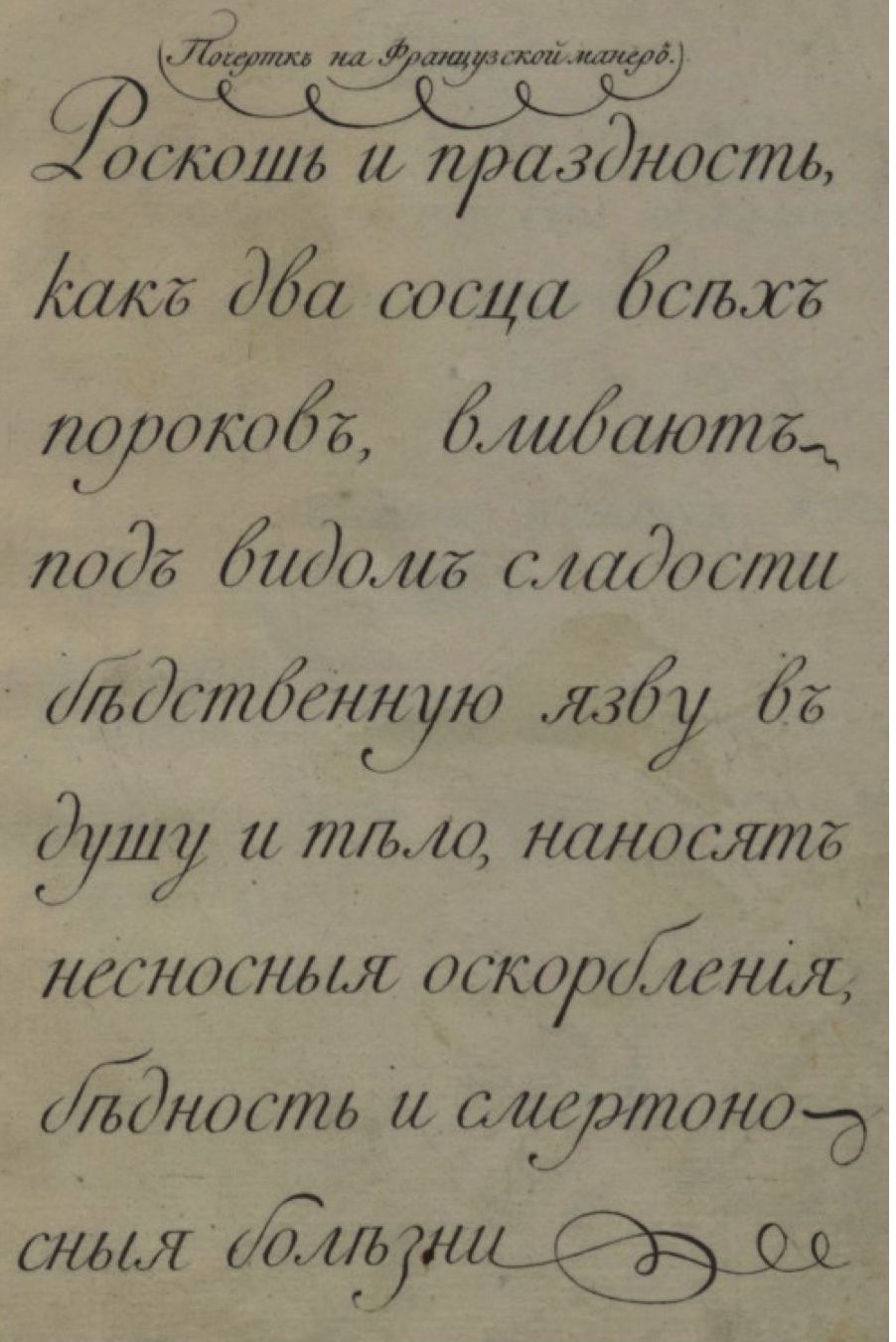 Ср. с одной из попыток «перевести французский характер в русские буквы» в руководстве по чистописанию, выпущенном в конце этого же столетия:
