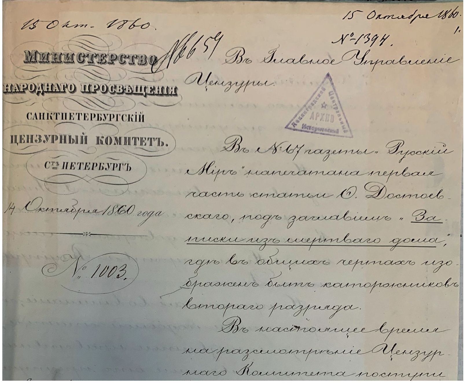 Fig. 11. From “The Case of the Resolution of the Second Part F. M. Dostoevsky’s Story ‘Notes from a Dead House’…” (Russian State Historical Аrchive)