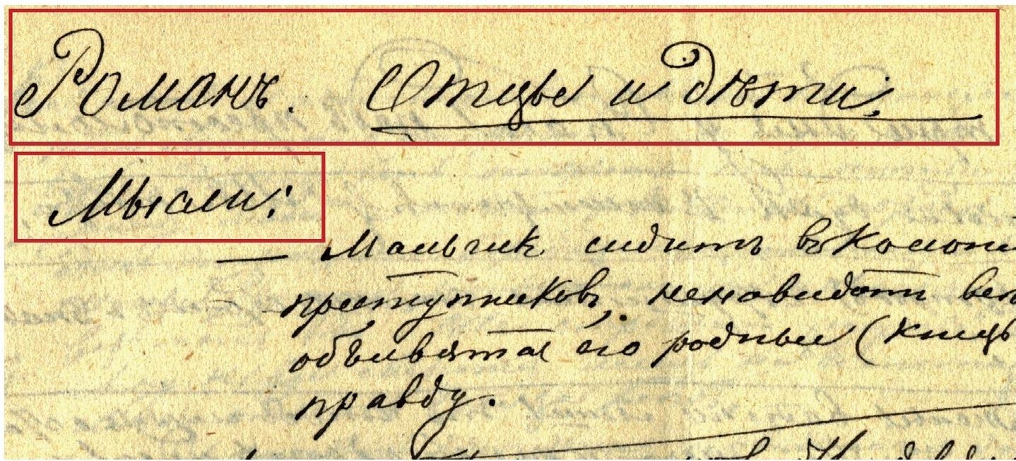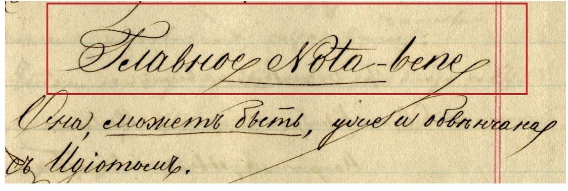 «Потом я вот тут написал другим шрифтом: это круглый, крупный французский шрифт, прошлого столетия, иные буквы даже иначе писались, шрифт площадной, шрифт публичных писцов, заимствованный с их образчиков (у меня был один), — согласитесь сами, что он не без достоинств. Взгляните на эти круглые д, а. Я перевел французский характер в русские буквы, что очень трудно, а вышло удачно» (Д35: 32).