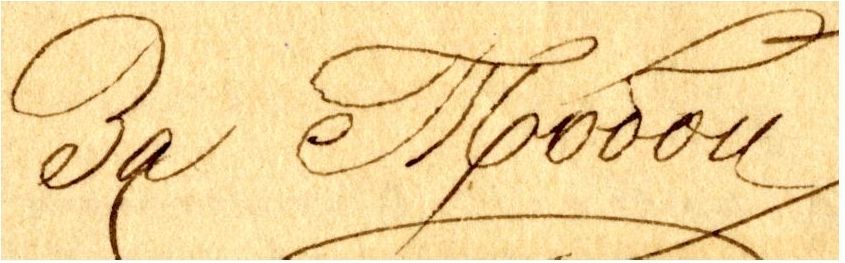 Это, однако, еще слишком общая характеристика. Поэтому сразу перейду к конкретным наблюдениям, начав с забавного казуса, который был рассмотрен мною в статье 2022 г. Еще не приступая к почерковедческой экспертизе рукописи 1854, я обратил внимание на тот факт, что без знания особенностей каллиграфического почерка Достоевского иногда могут возникать сложности с прочтением некоторых его каллиграфических прописей. Так, среди подготовительных материалов к роману «Преступление и Наказание» в рабочей тетради 1864–1865 гг. (РГАЛИ. Ф. 212.1.3) сделана отдельно стоящая каллиграфическая запись, которая при первой публикации получила прочтение: «За Пробой» [Баршт: 39, № 31]. Это прочтение было тождественно повторено и в новом академическом ПСС Достоевского, причем в примечаниях комментатор связал ее с той пробой, на которую в начале романа идет к старухе процентщице Родион Раскольников (см.: Д35; т. 7: 172, 777). В действительности же эта запись читается иначе: «За Тобой» (см. Илл. 1):