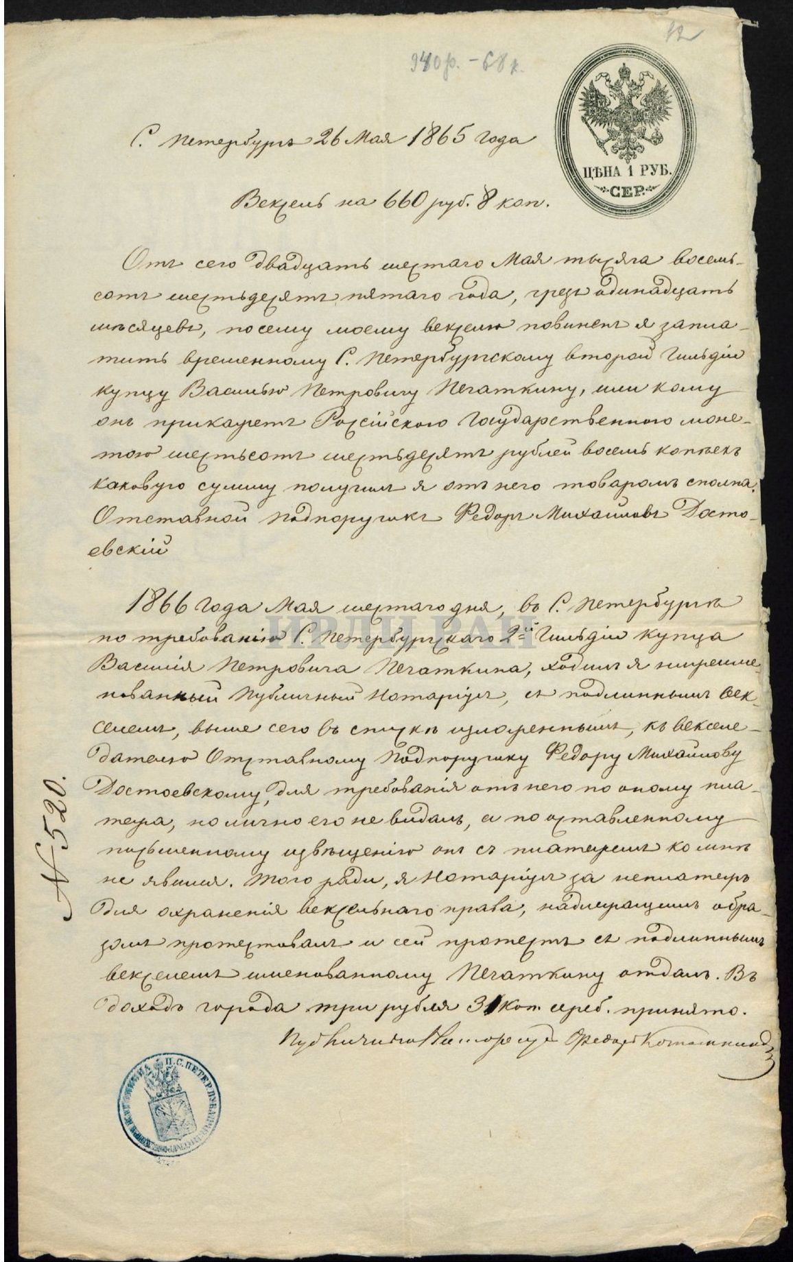 «Если книгопродавецъ не оселъ, онъ пойметъ что значитъ имя. Если они согласны немедленно задатокъ. По выходѣ изъ цензуры — контрактъ (я тебѣ пришлю полномочіе по формѣ, по закону). Контрактъ слѣдующій: 1) Рукопись въ руки, — деньги въ руки. 2) Печатать 2000 экземпляровъ <…>. 3) Я имѣю право печатать послѣ этого изданія черезъ 2 года. 4) Въ теченіе этого времени, если всѣ экземпляры выйдутъ, книгопродавецъ не имѣетъ права дѣлать 2го изданія. 5) Начать изданіе немедленно» (РГАЛИ. Ф. 212.1.36. Л. 8 об.; ср.: Д30; т. 281: 351).