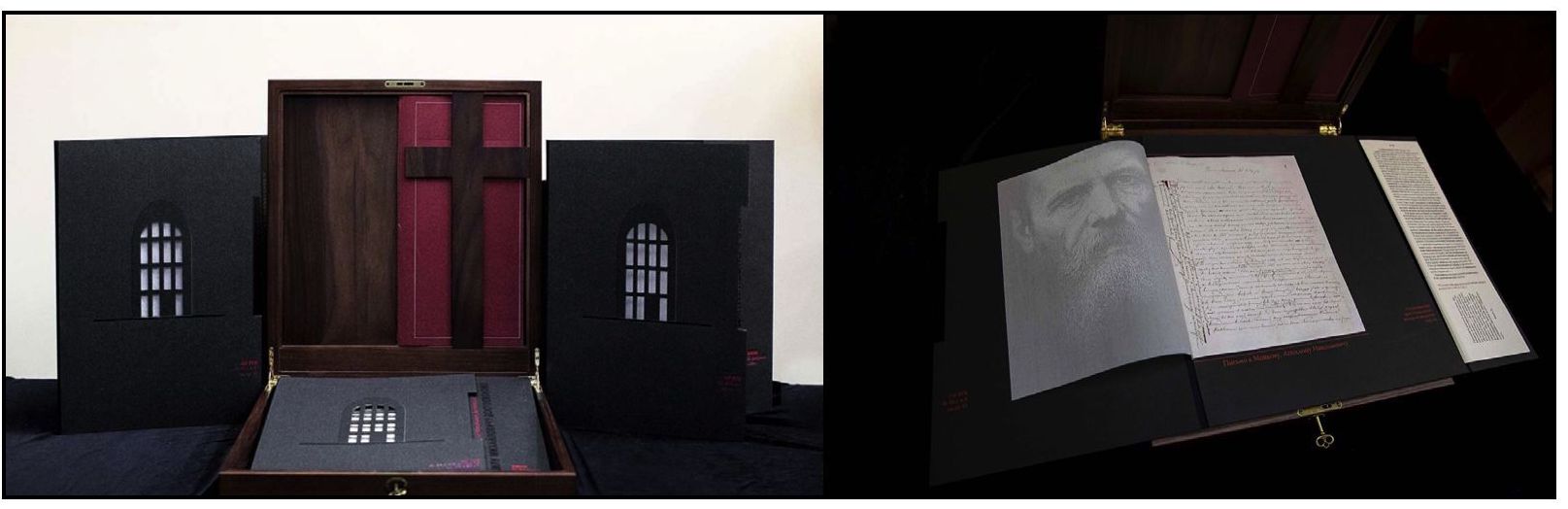 «Если вы читаете эти слова, значит, ларец данного необычного издания открыт», — так начинается предисловие издателя сибирских писем Достоевского А. Г. Елфимова, основателя и главы общественного благотворительного фонда «Возрождение Тобольска» [Ф. М. Достоевский: 5]. Слово «ларец» в данном случае совсем не метафора. Фонд «Возрождение Тобольска» неоднократно выступал в качестве издателя ценных научных материалов по русской литературе XIX в.; подготовленные им издания традиционно отличаются изящным, высокохудожественным оформлением и иногда очень необычны по своему внешнему виду. Таково, например, трехтомное «Евангелие Ф. М. Достоевского» (2017) [Евангелие], книги которого, по задумке художника-оформителя В. Е. Валериуса, заключены «в деревянный ящик, где они находятся словно в каземате за металлическими решетками и заперты на тюремный засов» [Ф. М. Достоевский: 6]. Таковы подготовленные фондом в 2019 г. в сотрудничестве с Отделом рукописей Российской государственной библиотеки факсимиле и оптико-электронная реконструкция рукописи «Острова Сахалин» А. П. Чехова — два увесистых тома большого формата, упакованные в дорожный «чеховский» чемодан [А. П. Чехов], [Чехов]. Эти и подобные им издания фонда «Возрождение Тобольска» предназначены прежде всего фундаментальным научным библиотекам, а также личным коллекциям состоятельных библиофилов. К числу таких экспериментальных публикаций относится и переиздание сибирских писем Достоевского. Представление о внешней форме столь необычной «книги» нагляднее всего дает предисловие ее издателя Аркадия Григорьевича Елфимова, из которого позволим себе еще несколько выдержек: