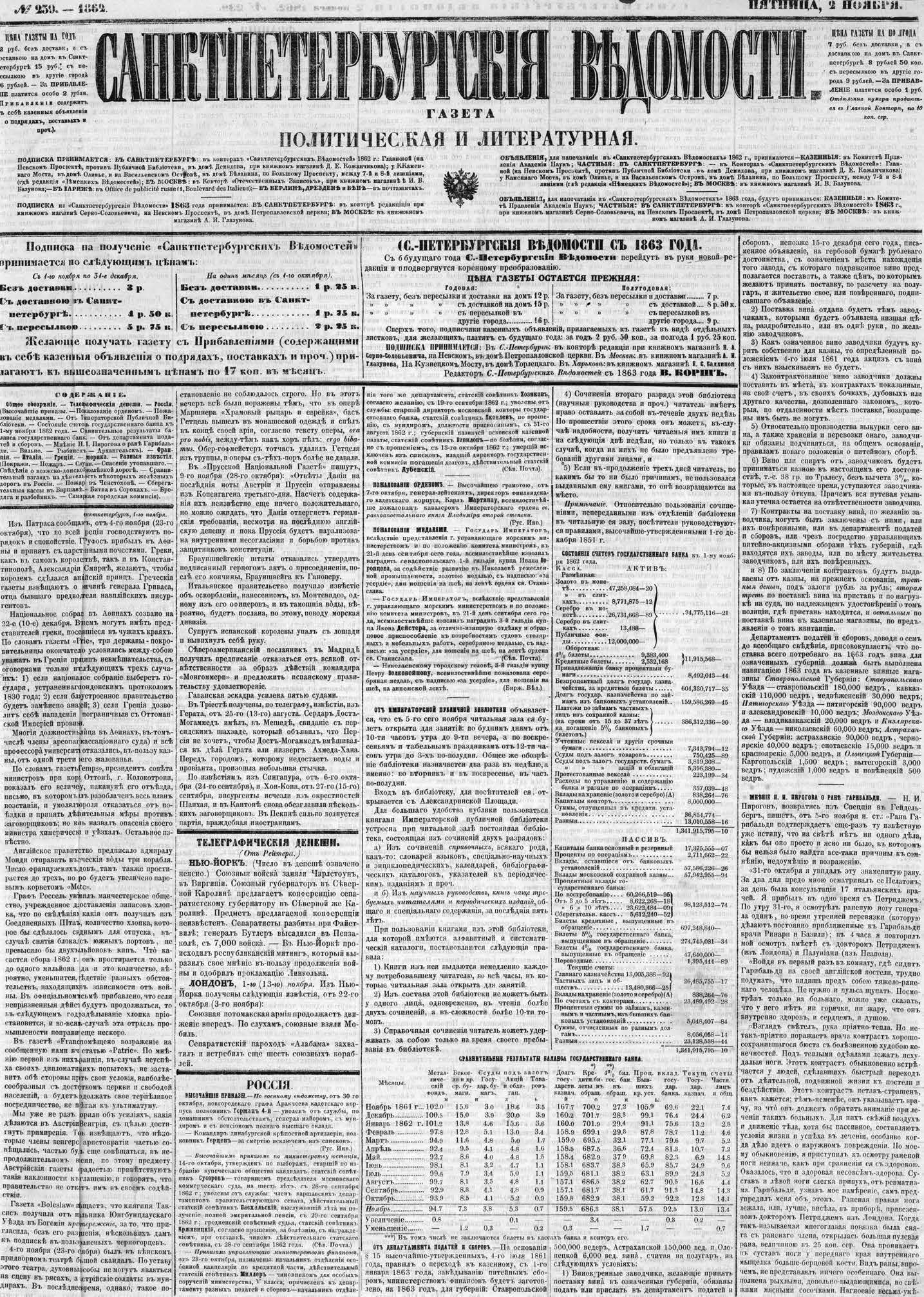 Fig. 4. The front page of the St. Petersburg Vedomosti newspaper (1862. No. 239. November 2) with a short article “N. I. Pirogov’s opinion on Garibaldi’s wound” (in the column on the right)