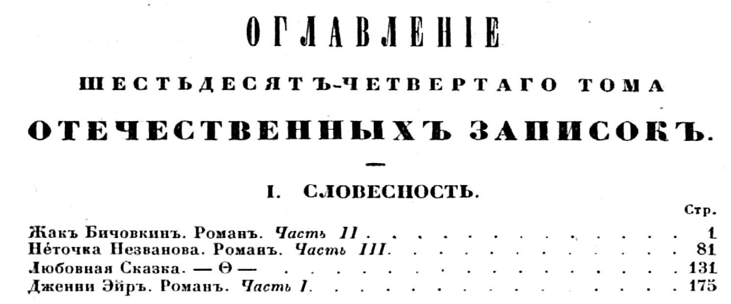 Оглавление майского номера по разделу «Словесность» вообще представляет собой сплошной казус: литературного имени лишился не только Достоевский, но и петрашевец А. Пальм, автор романа «Жак Бичовкин». Под псевдонимом «— Ѳ —» опубликована повесть скромного литератора И. П. Клюшникова «Любовная сказка», но за что пострадала Шарлотта Бронте, автор переводного романа «Джейн Эйр» (см. Илл. 2)?