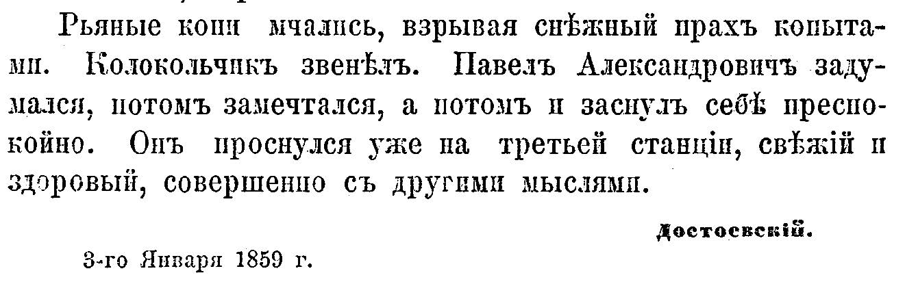 Так же, без инициалов, за той же подписью «Достоевскiй» была опубликована первая часть романа «Село Степанчиково и его обитатели» в ноябрьском номере «Отечественных Записок» (см. Илл. 6). И только при публикации второй части романа появилась полная литературная подпись писателя — «Ѳ. Достоевскiй» (см. Илл. 7).