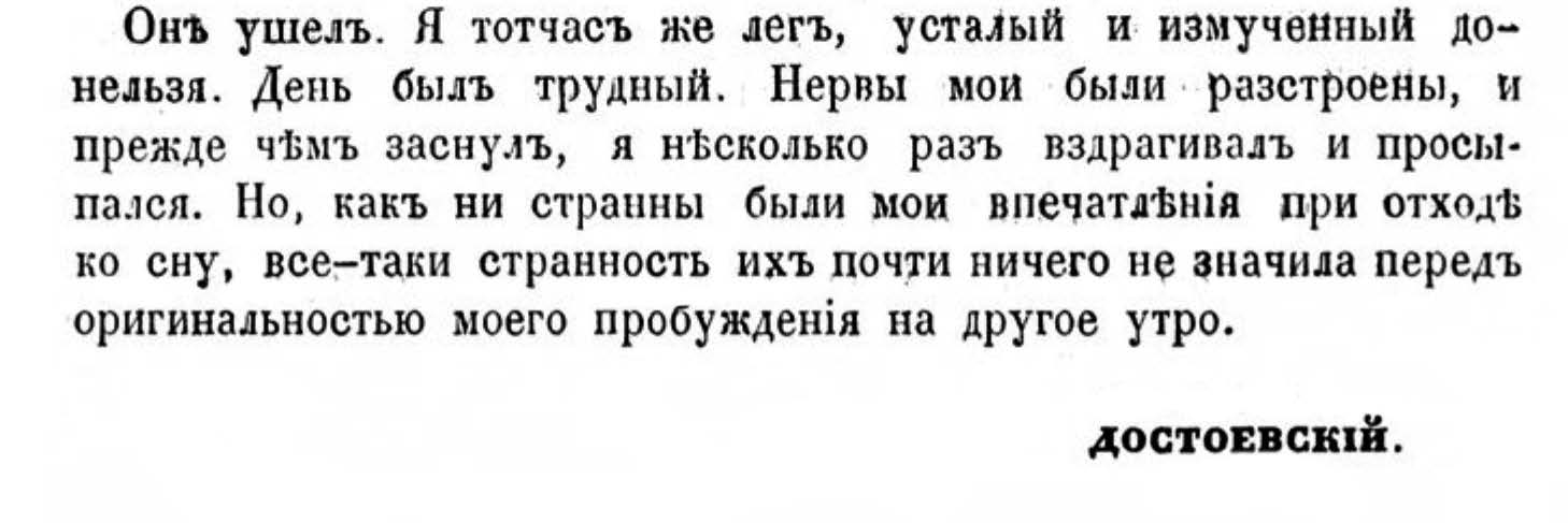 Эту подпись можно понять и как псевдоним, и как сокращение имени «М. Достоевскiй», и как ошибку наборщика или опечатку, не исправленную корректором. Так или иначе у Достоевского появился псевдоним «М. —iй». Без инициалов за подписью «Достоевскiй» в журнале «Русское Слово» (1859) была опубликована повесть «Дядюшкин сон» (см. Илл. 5).