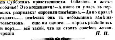 Конечно подобныя вещи не заслуживаютъ ни малѣйшаго опроверженiя; конечно всякiй, кто читалъ “Воспоминанiя” г. Страхова, прочитавъ потомъ статейку “Современника”, ни минуты не задумается, не получитъ и тѣни сомнѣнiя относительно смысла и значенiя этихъ “Воспоминанiй”. Но статейка очевидно вовсе и не имѣла въ виду тѣхъ, кто читалъ статью г. Страхова; напротивъ она именно имѣла въ виду тѣхъ, кто статьи не читалъ, кто на вопросъ о ней пожалуй скажетъ: “не читалъ, да и читать не хочу!” для такихъ написана статейка, и такiе найдутся, и такiе ей повѣрятъ.