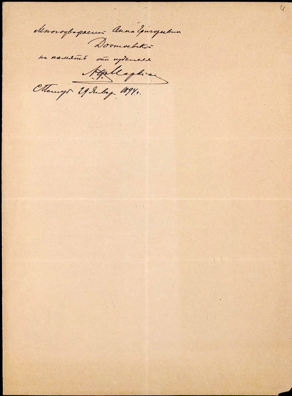 Илл. 3. Дарственная надпись от А. Ф. Маркса А. Г. Достоевской18