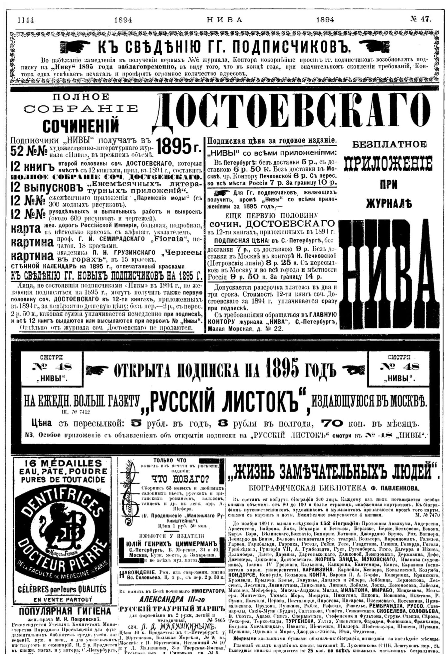«Пожелавъ выдѣлить наступающiй 1894 годъ, мы даемъ, какъ безплатное приложенiе при Нивѣ, "Сочиненiя Ѳ. М. Достоевскаго", автора, исключительно стоящаго въ нашей литературѣ, произведенiя котораго должны составить главное основанiе домашней библiотеки каждаго образованнаго человѣка. Вслѣдствiе дороговизны, сочиненiя эти до сихъ поръ не были доступны по цѣнѣ большинству, для котораго мы и даемъ случай прiобрѣсти ихъ нынѣ, какъ безплатное приложенiе при Нивѣ за 1894 г.»14.