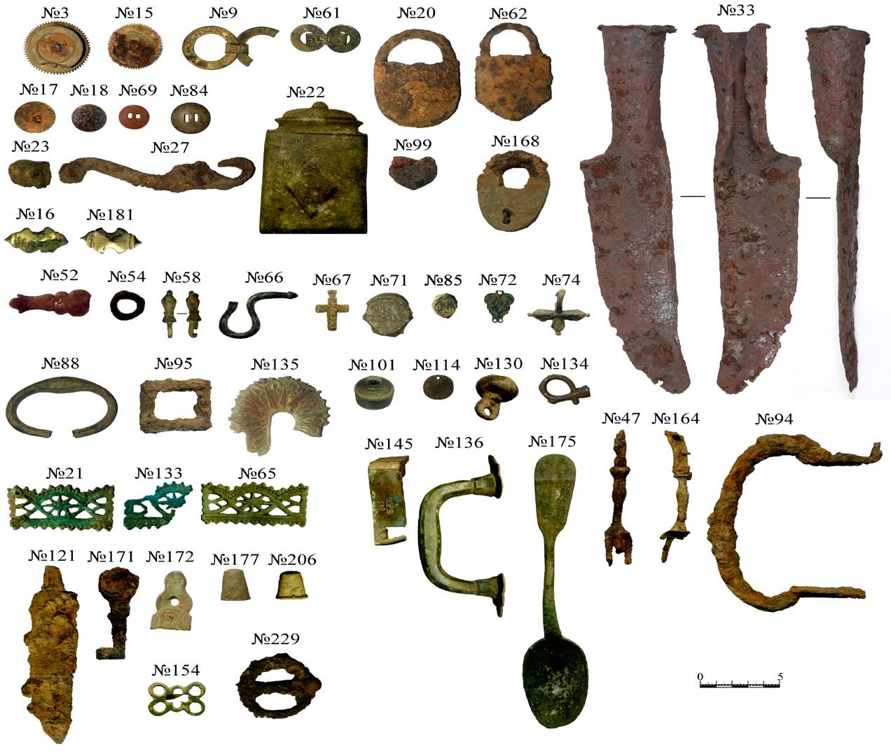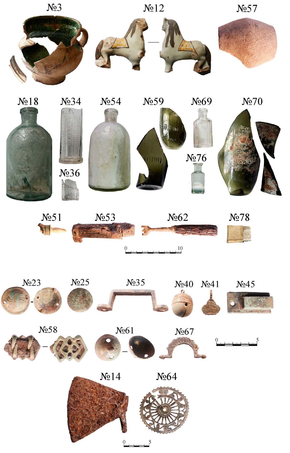 - Предметы из раскопа 2018 г. №№ 3–7, 27, 19, 30, 34, 35 — железо; №№ 1, 6, 8, 17, 18, 16, 21, 22, 23, 38, 54 — медный сплав; 42 — олово; №№ 28, 31, 51–53 — керамика (на предмете № 28 вензель с буквами А и Е); 46 — фаянс; №№ 11, 36, 40 — стекло; №№ 49–50 — фарфор (глухое стекло?).