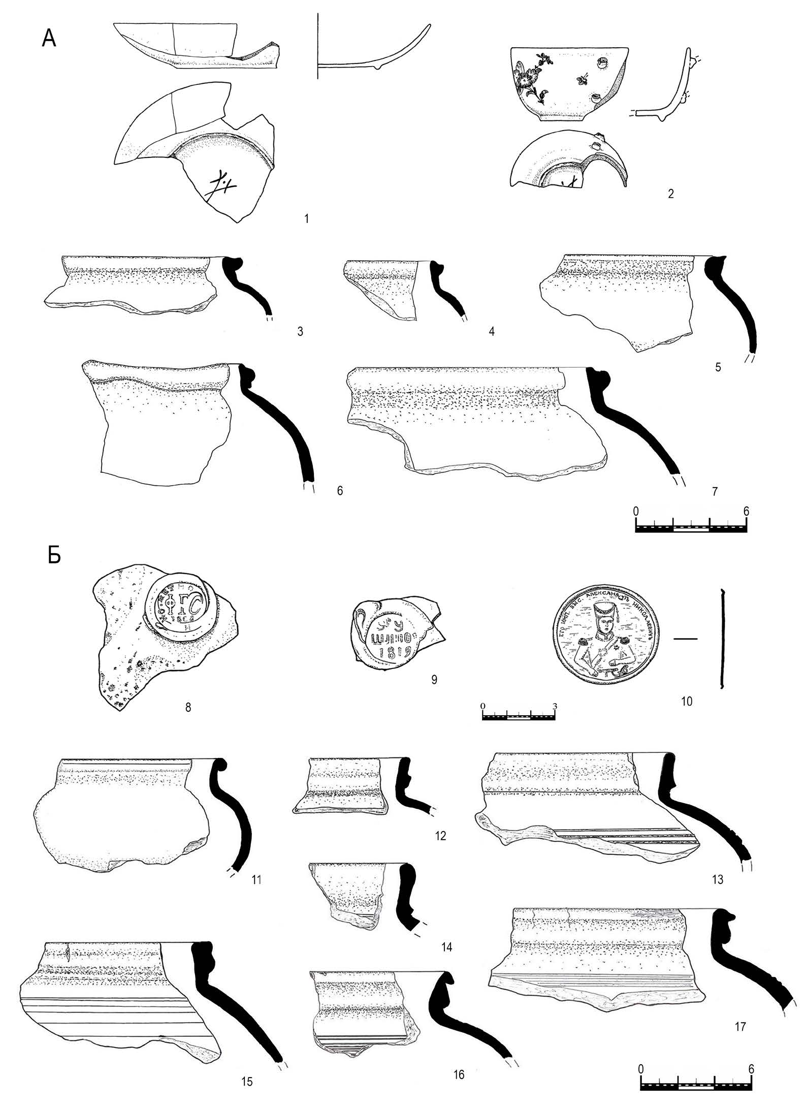 - Образцы венчиков и датирующие находки из ям 22 и 35 по: [Сыроватко, Дементьева, Потемкина]. А — образцы венчиков и датирующие находки из ямы 1–2 — фарфоровая посуда с клеймами; 3–5 — венчики типа 1; 6, 7 — венчики типа 2. Б — образцы венчиков и датирующие находки из ямы 35. 8–9 — клейма на штофах; 10 — металлическая накладка медного сплава. 11 — венчик типа 3; 12–14 — венчики типа 2; 15–17 — венчики типа 4.