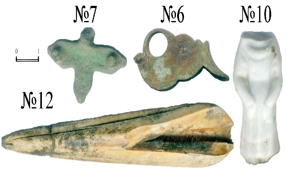 - Предметы из раскопа 2009 г. №№ 6–7 — медный сплав, 10 — фаянс, 12 — кость.