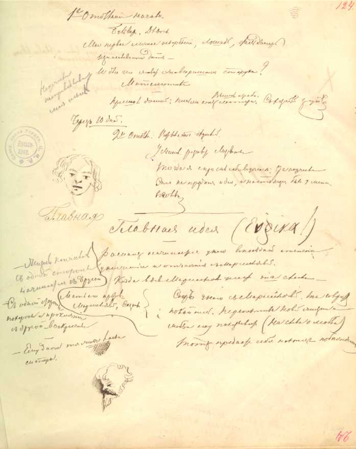 Пропись «Главная» в левой части страницы связана с заголовками фрагментов сюжета «Преступления и Наказания»: «Главная идея» и «Eνρικα»14, фиксирующими основную сюжетную коллизию «Преступления и Наказания»: «Спор у него с Мармеладовой. Та говорит: покайтесь. <…> Перспективы новой жизни и любви ему показывает. <…> С одной стороны похороны и проклятие, с другой — воскресение» (7; 138).