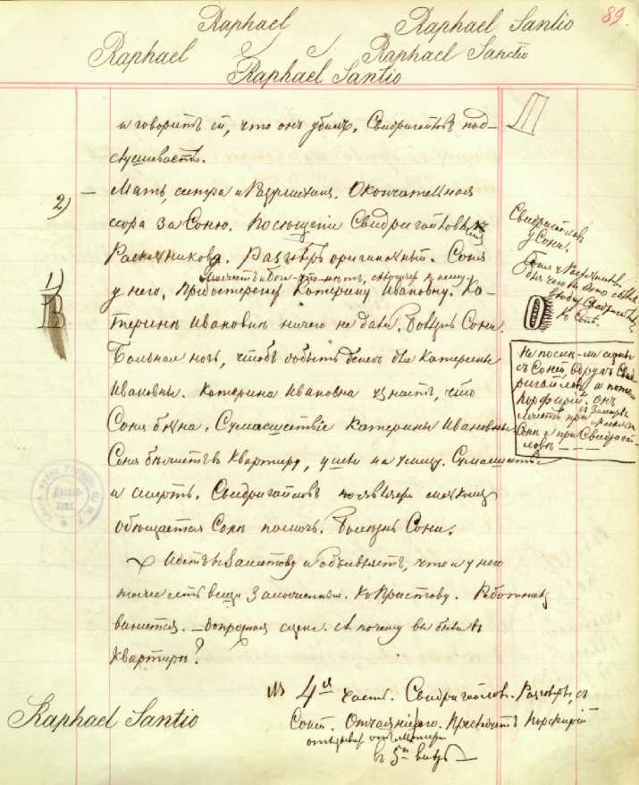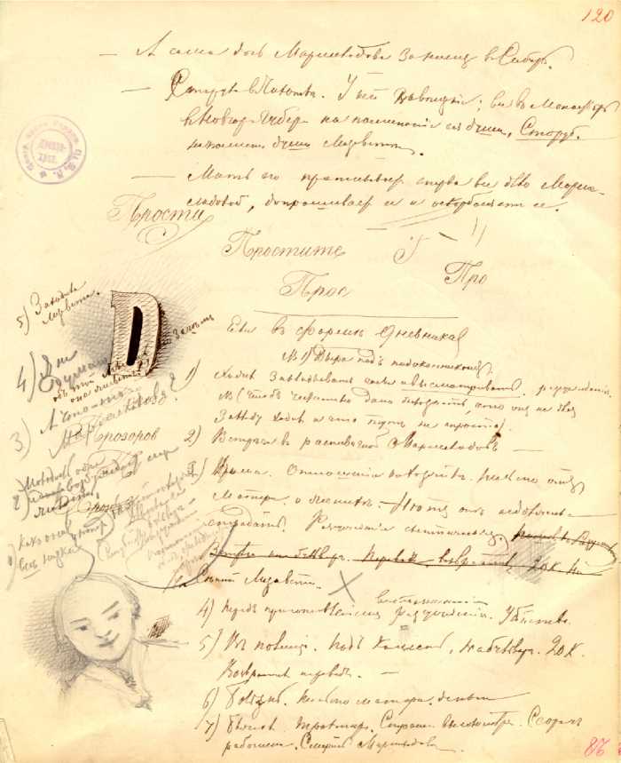Записи «Про», «Прост», «Простите», «Прости<тутка>» (?) в середине листа, выше портретного рисунка, изображающего молодую девушку, предположительно — Соню Мармеладову, сделаны после завершения формирования сюжетного хода, связанного с ее «оскорблением» со стороны Пульхерии Александровны Раскольниковой, заподозрившей ее в соучастии в преступлении: «Мать его приписывает сперва все дело Мармеладовой, допрашивает ее и оскорбляет ее» (7; 141)15.