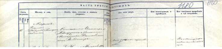 Восприемниками его будут те же Варвара Михайловна Карепина и Александр Петрович Милюков. Он проживет еще меньше своей старшей сестры, умерев в полтора года «от зубных припадков», и похоронен будет уже на Митрофаниевском городском кладбище: