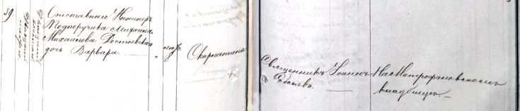 Служащій въ Сиротскомъ Институтѣ Воспитательнаго дома Титулярный Совѣтникъ Александръ Петровъ Милюковъ и умершаго Надворнаго Совѣтника Петра Андреева Карепина жена Варвара Михайлова Карепина. | Протоіерей Iак<овъ> Предтеченскій съ дьячкомъ Петромъ Каменевымъ | Достоевскій. |
