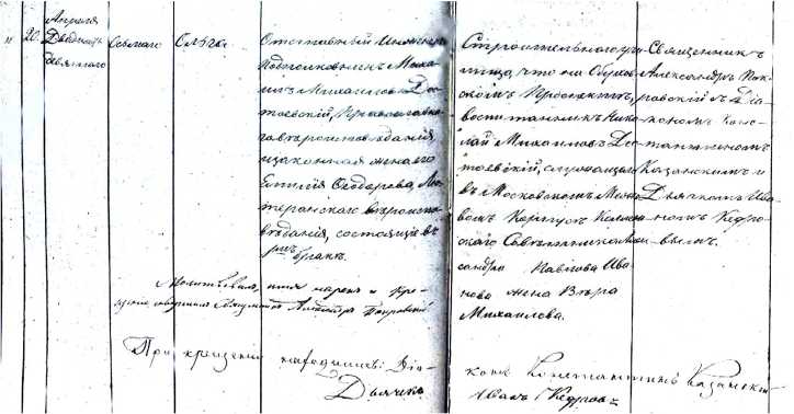 Воспитанникъ Строительнаго училища Николай Михаиловъ Достоевской Коллежскаго Совѣтника Доктора Ремесленнаго заведенія и Межеваго Института Александра Павлова Иванова жена Вѣра Михаилова, а за отсутствіемъ ея отъ купели принимала Коллежскаго Ассессора Александра Кавка дочь дѣвица Надежда Александрова Кавка. | Священникъ Константинъ |