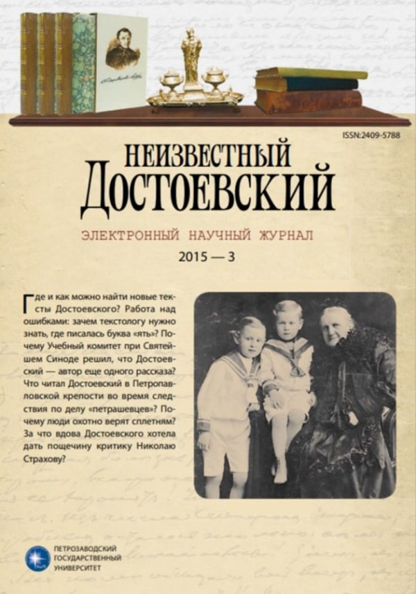 В 2005 году ИРЛИ (Пушкинский Дом) РАН выпустил фундаментальный труд — научное описание библиотеки Ф. М. Достоевского [2]. За исключением нескольких десятков разрозненных экземпляров, чудом сохранившихся в некоторых книгохранилищах, архивах и музеях Петербурга и Москвы, сама библиотека писателя до нашего времени не дошла. В основу научного описания были положены четыре списка книг, составленных уже после смерти Достоевского, в разное время и по разным поводам, его вдовой — Анной Григорьевной. Большинство книг в списках А. Г. Достоевской были зарегистрированы кратко, без необходимой библиографической точности. Нередко та или иная запись могла обозначать несколько разновременных изданий или даже разных названий книг одного автора, несколько вариантов того или иного сборника и т. д. Составителями была проведена кропотливая аналитическая работа по идентификации книг из библиотеки Достоевского, но тем не менее в целом ряде случаев сохранилась вариативность библиографического описания, поэтому труд сотрудников Пушкинского Дома получил подзаголовок: «Опыт реконструкции».