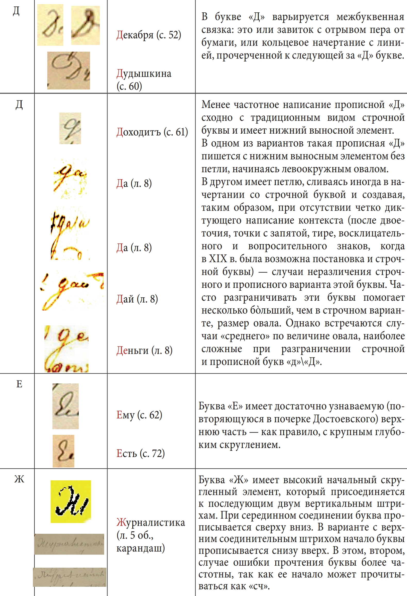 Начальным этапом данного исследования стало прочтение рукописей, обнаружение разночтений с их первыми научными изданиями6. На втором этапе велись наблюдения над написаниями всех букв алфавита (как строчных, так и прописных), осуществлялась их систематизация. Наконец, на третьем этапе мы попытались проследить, как менялся почерк в пределах одной записной книжки, и дать характеристику каждой букве алфавита Достоевского. Результаты представлены в таблице ниже.