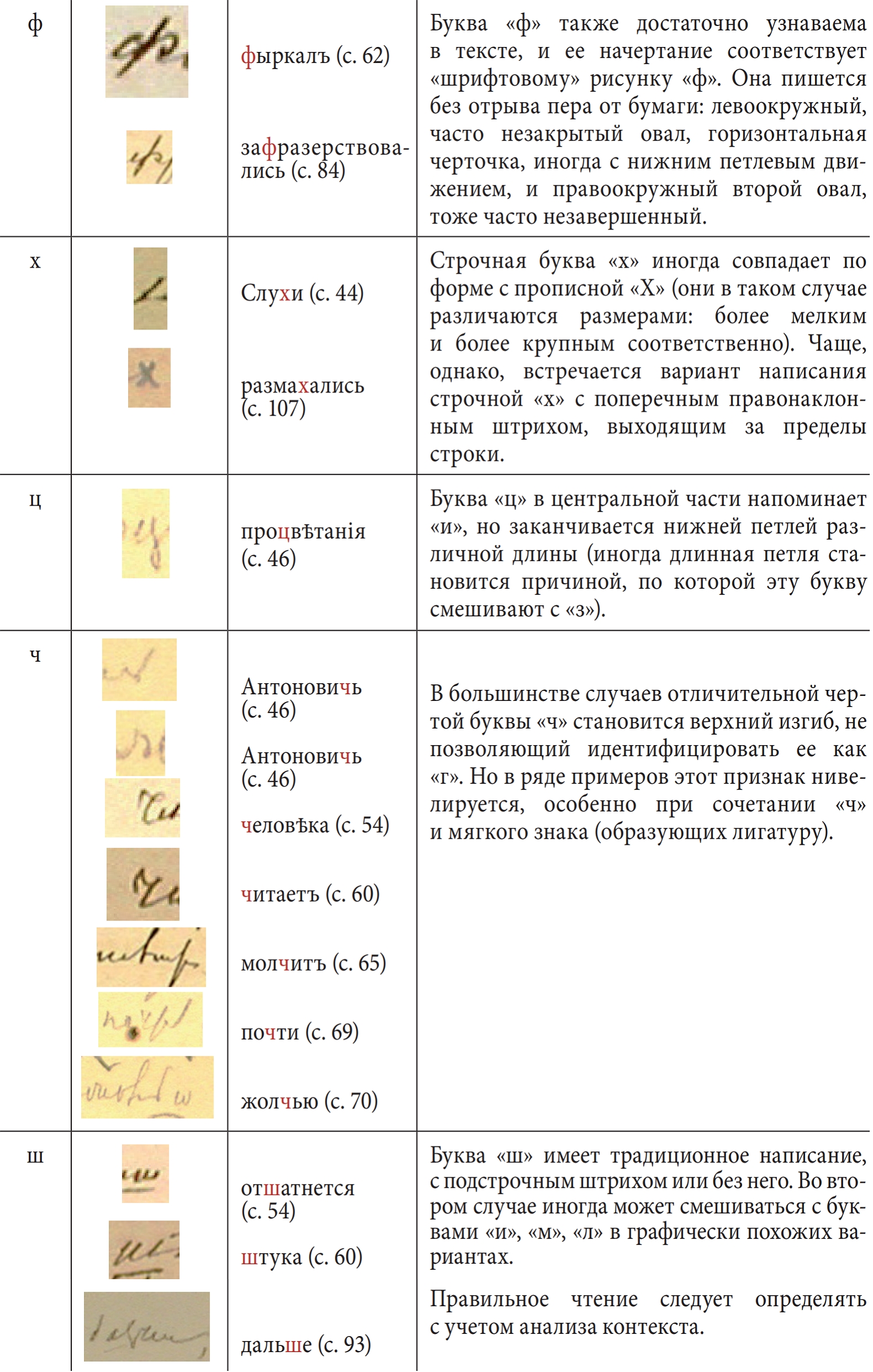 В приведенных же выше (со с. 109 ЗК) трех вариантах написания буквы «и» характерно то, что все примеры находятся в непосредственной близости друг от друга, на одной странице, в соседних предложениях. Поэтому объяснить разницу в начертаниях буквы «и» (более частотный вариант, с длинным высоким росчерком, и реже встречающийся, с полуовалом) невозможно ни разными типами документа, ни особенностями скорописи (все слова были написаны одномоментно), ни особыми условиями письма (непривычной позой, некачественной бумагой, разными видами инструментов для письма, плохим освещением, физическим недомоганием, расстройством и пр.). Все перечисленные выше условия были идентичны во всех трех примерах, тем не менее возникли разные варианты начертания буквы. Это обусловлено только самой особенностью выработанного почерка: существованием в нем большого количества вариантов написаний одного и того же знака. Данный пример, как и все другие, приведенные выше примеры, достаточно ясно указывает на проблемы расшифровки почерка Достоевского. Основные причины возникновения ошибок прочтения рукописного текста — это неразграничение начертаний, неверное их зрительное восприятие, чтение слов по «общему рисунку», неточное распознавание типичных графических признаков конкретных букв, недостаточная опора на семантику фразы. Таким образом, небесполезной оказывается работа по систематизации начертаний и составлению своего рода «графической азбуки» — описания букв в почерке Достоевского в алфавитном порядке.
