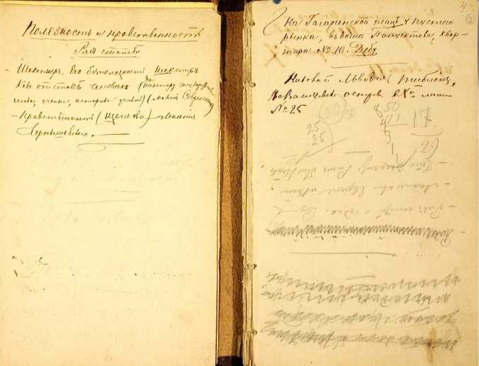 Справедливости ради следует сказать, что на с. 3 Достоевский делает также запись: «Нравственность Щеглова». По мнению Л. Р. Ланского и С. С. Борщевского, она намекает на вторую статью Д. Ф. Щеглова «Экономические реформы Рима. По поводу статьи г. Леонтьева: “О судьбе землевладельческих классов в Риме”» [ЛН, 83, 159]. Так как вторая статья впервые была опубликована в № 6 «Времени» за 1861 г., то данную запись Достоевский мог сделать только после июня 1861 г. Однако предыдущие замыслы (с. 4–5) были вписаны карандашом в направлении, обратном основному тексту, и выполнены так же небрежно, как и многие карандашные расчеты в данной ЗК, которые, как увидим ниже, могли появиться начиная с 1860 г. Кроме того, с. 3 была оторвана и могла быть возвращена