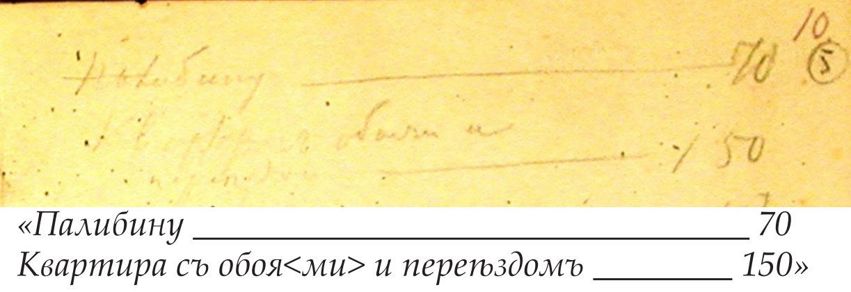 В доме действительного статского советника профессора Н. А. Палибина (3-я рота Измайловского полка) Достоевский снимал квартиру с декабря 1859 г. по 15 августа 1861 г. [Тихомиров, 2016: 61–65]. В «Летописи…» указано, что в октябре 1860 г. вместо прежней квартиры в доме Н. А. Палибина (№ 10)6 Достоевский снимает здесь же «квартиру под № 12 с 16 октября 1860 года по 15-е августа 1861 года <…>7 В связи с этим в “Проекте расходов” в Записной книжке 1860–1862 гг. появляется помета» [Летопись: 297]. Итак, данная запись свидетельствует о переезде в октябре 1860 г. из одной квартиры (№ 108) в другую (№ 12)9 в одном и том же доме владельца Палибина, именно поэтому Достоевский и хотел рассчитаться за одну квартиру по октябрь, чтобы спокойно въехать в другую.