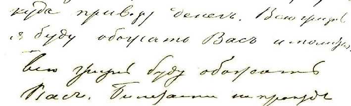В анализируемых же письмах встречается упрощенный скорописный индивидуальный вариант написания этой буквы, создающийся одним сложным по конфигурации движением без отрыва пера от бумаги: