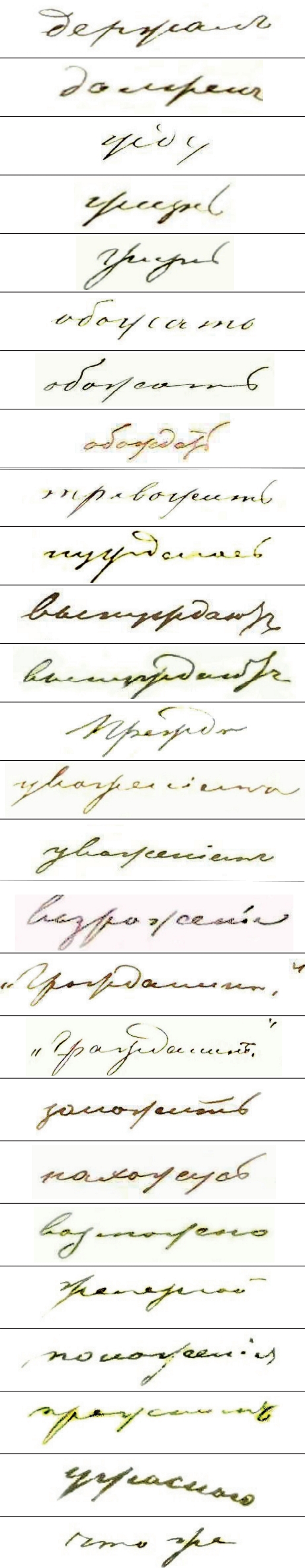 Почерк во всех, без исключения, исследуемых образцах: простой высоковыработанный, с элементами упрощений и усложнений и вариационностью в написании некоторых одноименных элементов (букв и соединений); темп письма быстрый19, координация движений — высокая.