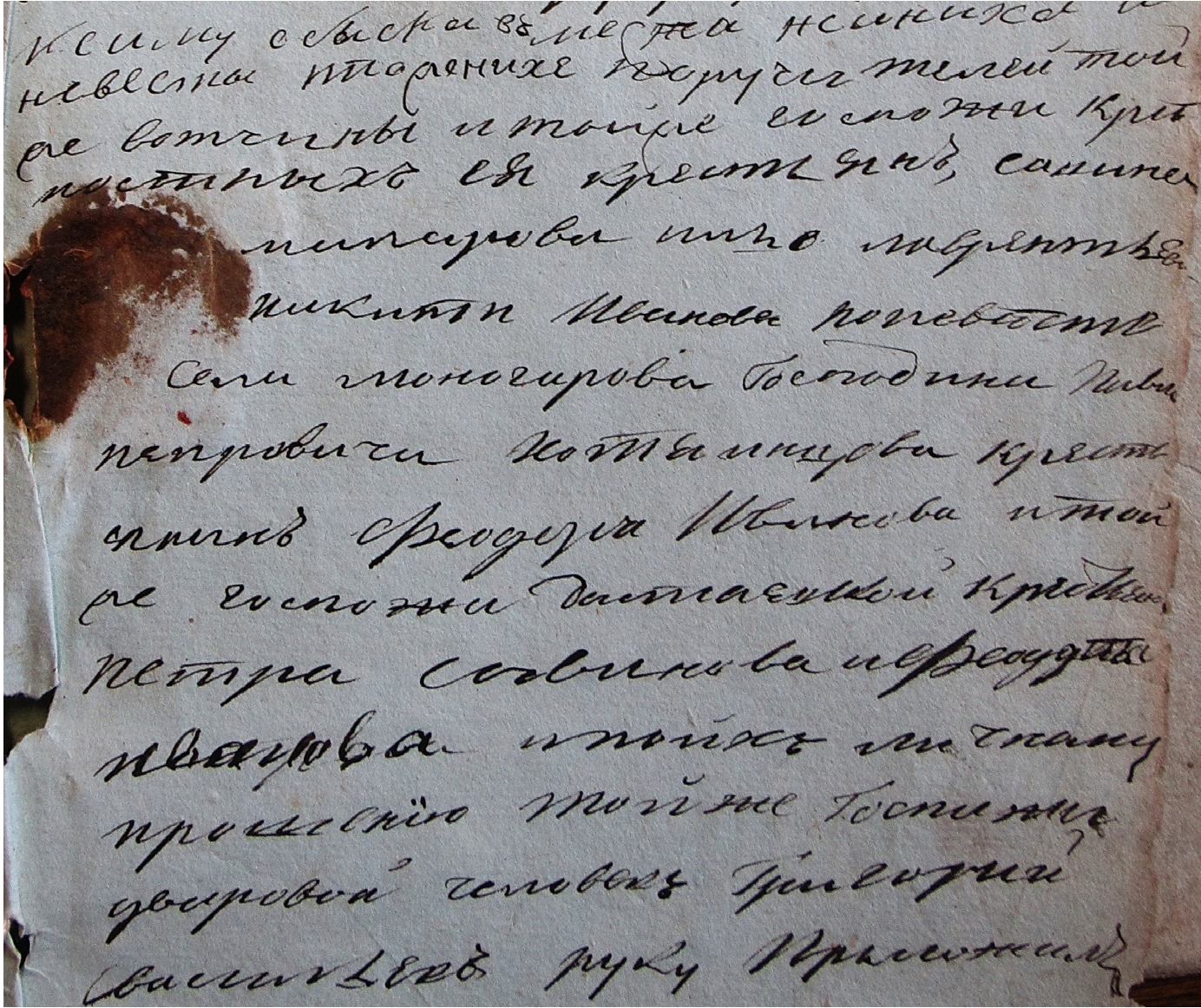 Запись второго поручителя расположена ниже и занимает 16 строк, сделана с многочисленными ошибками, слева от нее — чернильное пятно от печати на обороте листа: «Ксиму обыска въ места жиниха и невесты и по женихе поручителей той же вотчины и тойже госпожи крѣпостныхъ ея крестьянъ, Савина Макарова Илие Лаврентьева Никиты Иванова по невѣсте села Моногарова Господина Павла Петровича Хотяинцова крестьянинъ Феодора Иванова и той же госпожи Дастаевской крестьянъ Петра Савинова и Феодота Иванова и по ихъ личному прошенiю той же Госпожи дворовой человекъ Григорий Васильевъ руку приложилъ»5 (эта запись воспроизведена в книге В. С. Нечаевой «В семье и усадьбе Достоевских» в виде иллюстрации на вклейке после 112 страницы. — Cм. илл. 3).