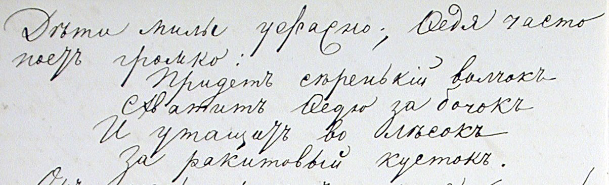 «Ужасно хочу увидѣть тебя и Ѳечту, Люба называетъ его не Ѳедичка, а Фечта», «Ѳедя… говорить: долога, тли (3), дологи капа ну-ну-ну, значитъ дорога папа прiѣдетъ. Потомъ заложитъ руки за спину гуляетъ15 и говоритъ: мама гляди, Ѳедя фодитъ»16. А. Г. Достоевская вставила в текст своих сообщений супругу (из Старой Руссы в Эмс от 28 мая, 12 и 15 июня 1875 г.) стихи и песни, сочиненные и услышанные Федей и Любой.
