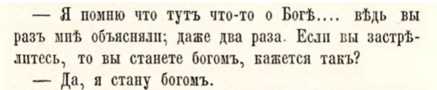 «— Я помню, что тут что-то о боге… ведь вы раз мне объясняли; даже два раза. Если вы застрелитесь, то вы станете богом, кажется так?