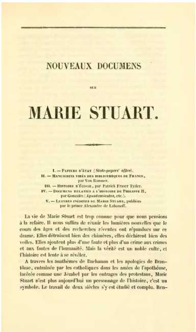 Чтобы дополнять Шиллера, Достоевскому следовало вооружиться знанием историографической фактуры, что он и предпринял, по свидетельству Ризенкампфа. В эту сторону его подтолкнули и события, происходившие в самой исторической науке, в источниковой базе ее. Открылись факты, не известные Шиллеру, завершившему работу над трагедией в 1800 г., да и Вальтеру Скотту, опубликовавшему «Аббата» в 1820 г. В последующие десятилетия, предшествовавшие замыслу молодого Достоевского, усилиями историков были представлены миру многие документы, приоткрывающие тайны биографии Марии Стюарт38.