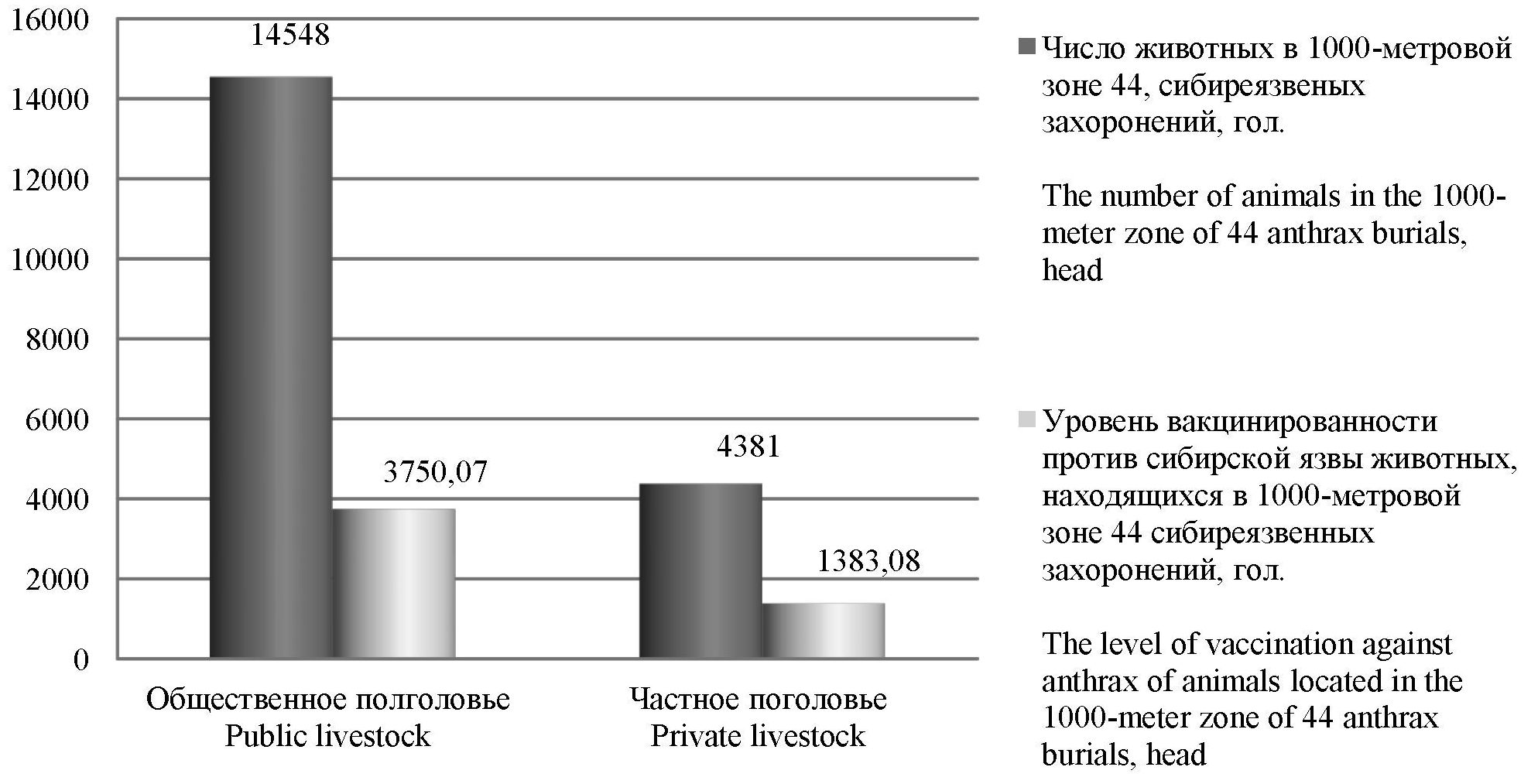При анализе представленных данных установлено, что на территориях, прилегающих к 44 сибиреязвенным захоронениям, расположенным на территории Удмуртской Республики, на 1 января 2023 года находилось 18 929 голов восприимчивого к сибирской язве поголовья сельскохозяйственных животных, за исключением животных, обитающих в естественных условиях, из них 4 381 голова животных частного сектора, или 23,14 % поголовья, и 14 548 голов общественного сектора (76,86 %).