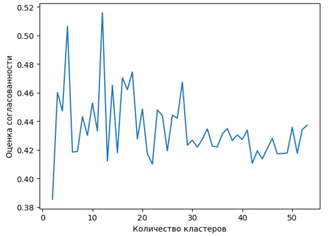 2.1.3. Оценка разбиения на кластеры. Следующий шаг в исследованиях был направлен на определение примерного «оптимального» количества тематических кластеров. Была применена метрика согласованности тем (Topic coherence) как показатель связности при тематическом моделировании для того чтобы оценить, насколько интерпретируемы темы. В этом случае темы представлены как первые N слов с наибольшей вероятностью принадлежащих к некой конкретной теме. То есть, показатель связности свидетельствует от том, насколько эти слова похожи друг на друга для разного количества тем.