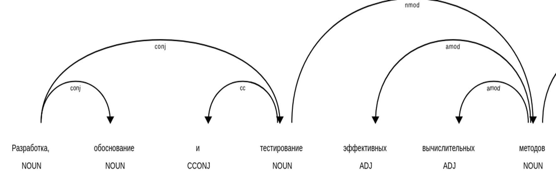 3.2. Методы. Разбор предложений на структуры был выполнен с помощью лингвистических правил [20], где было выделено: «что делается», «какими методами», «в какой области» и «какой результат должен получиться». Для этого была проанализирована структура предложения, определены связанные слова с применением частеречных меток (POS-тэгирование, part-of-speech tagging), и т.д. Схематически этот процесс разбора содержания паспорта специальности иллюстрируется на рисунке 7.