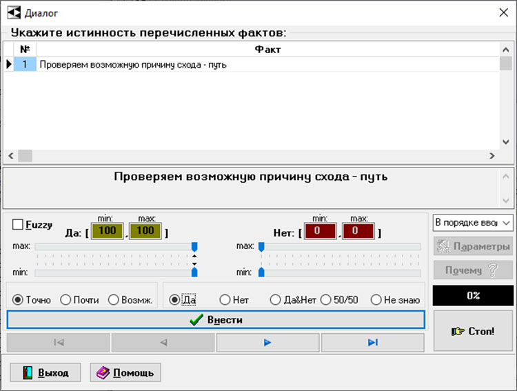 Хорошим вариантом для первоначального заполнения БЗ будет разбиение каждой группы причин как минимум на 3-5 подгруппы и формирование диаграммы для каждой подгруппы. Таким образом, получается до 5 групп причин, которые, в свою очередь, разбиваются на 4-6 подгрупп, каждая из которых содержит как минимум 3-4 категории факторов, состоящих из 2-6 факторов схода. В результате получаем минимальное число правил для БЗ, которых будет достаточно для первоначального функционирования ЭС. Всего при разработке ЭС использовались восемнадцать диаграмм, каждая из которых при необходимости может быть развита и дополнена. Соответственно расширяется и БЗ. На данный момент ЭС содержит 684 факта и 431 правило.