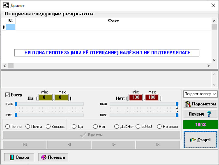 Если выбранная версия не подтверждается, в окне с результатами диалога появляется соответствующее сообщение (рисунок 8). Подсистема объяснений («Почему?») предоставит ход рассуждений, приведших к результату.