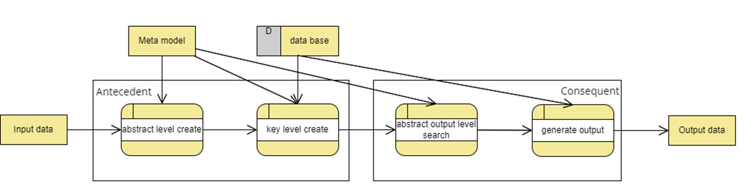 Второй блок – Consequent – блок построения следствий правил, который состоит из формирования абстрактного вывода базы правил второго уровня (abstract output level search) и генерации нечеткого логического вывода (generate output) на основе нечетких термов, полученных из предыдущего процесса. При формировании абстрактного вывода задействована метамомодель интегрируемой информационной системы (meta model), а при генерации четкого логического вывода участвует только база данных интегрируемой информационной системы (data base).