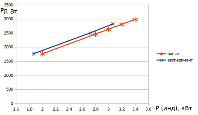 Рис. 1а. Валидация математической модели по экспериментальным данным мощности, выделяемой в разряде от мощности на индукторе