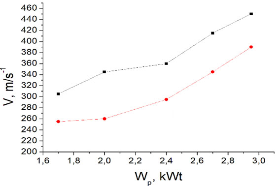 Рис. 1б. Зависимость скорости потока плазмы аргона на срезе разрядной камеры от мощности разряда, черная линия – при расходе 0,14 г/с, красная – при расходе 0,1 г/с