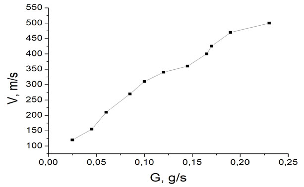 Рис. 2а. Зависимость скорости потока плазмы от расхода плазмообразующего газа при мощности разряда 2,4 кВт на срезе плазмотрона на оси камеры.