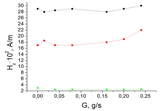В плазменной струе аксиальная компонента Нz относительно расхода ведет себя практически линейно (рис. 2б). Следовательно, наблюдается постоянство напряженности поля при разных расходах.