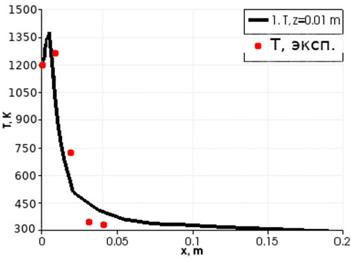 - Пространственное распределение характеристик струйного ВЧИ-разряда пониженного давления. Обнаружен эффект образования зоны перегрева по периферии струи около входного отверстия вакуумной камеры, в котором температура потока на периферии струи выше температуры в центре струи на 50∘C при скорости потока на входе в вакуумную камеру более 440 м/с и расходе плазмообразующего газа более 0,16 г/с при 2,4 кВт, который подтвержден экспериментально с помощью термопар, расположенных на разном расстоянии от центра потока. Из рис. 3 видно, что на периферии струи наблюдается температурный пик, температура в центре потока выше на 51 градус, в то время как в расчетах получено превышение на 131 градус Цельсия. В центре расчетная – 1231 К, на периферии – 1362 К, экспериментальная в центре – 1197 К, на периферии – 1248 градусов, то есть максимальное значение температуры создается на периферии струи, а локальный минимум температуры достигается в центре. Температура в поперечном сечении быстро спадает при удалении от струи. Точками обозначены экспериментальные данные (рис. 3), отклонение составляет не более 20%.